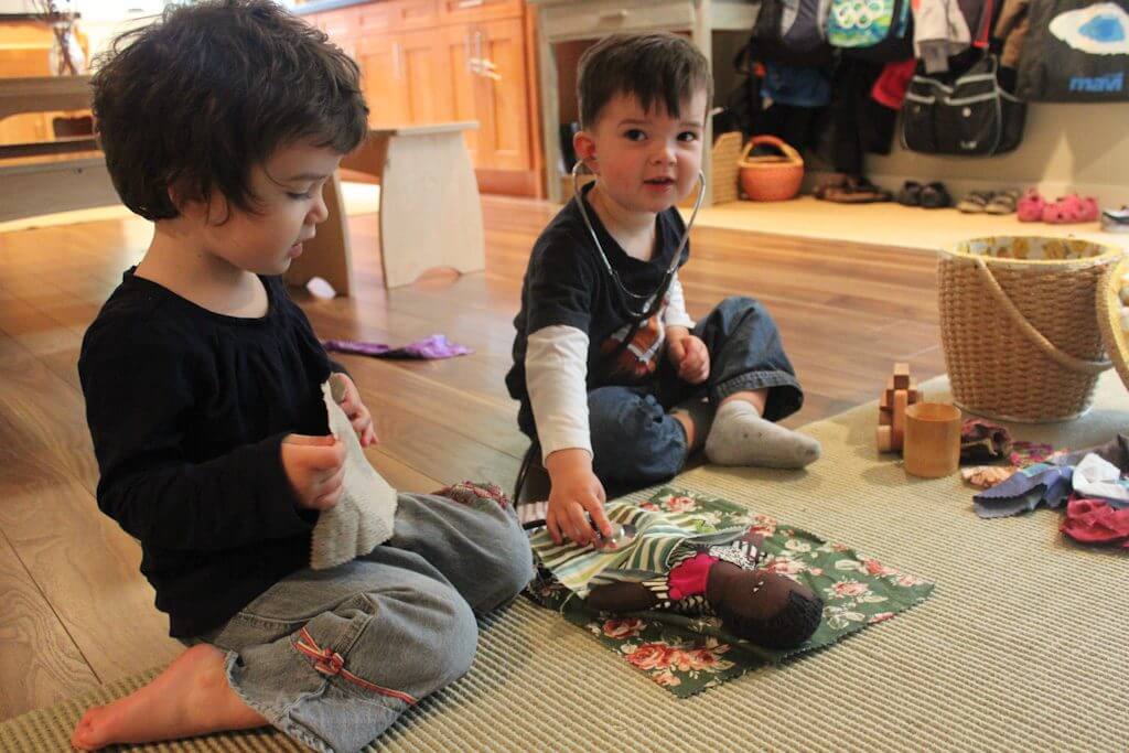 I had recently introduced a basket of a variety of scrap fabrics and these quickly became bedding and bandages for sick babies (it never ceases to amaze me what children can come up with when they are given open-ended materials!). They carted these up into the loft and declared it their hospital. I watched them and marveled at how precisely their play mirrored their experiences and the conversations they had been involved in or overheard. “Are you sore?” “Do you need anything?” “Can I get you something to eat?” “Time for an appointment!” “I’m going to give you a big hug! Are you better now?” They expressed care, concern, empathy, love, fear, and patience as they nursed their dolls (they much preferred the dolls to be their patients than trying out that role themselves).